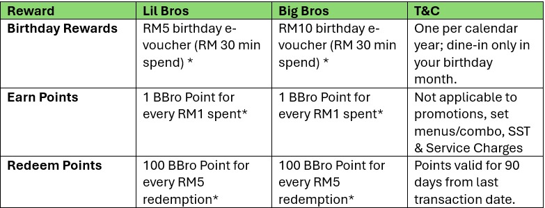 - Big Bros: Spend RM5,000* within the membership year. If you spend less, your status will be adjusted to Lil Bros.
